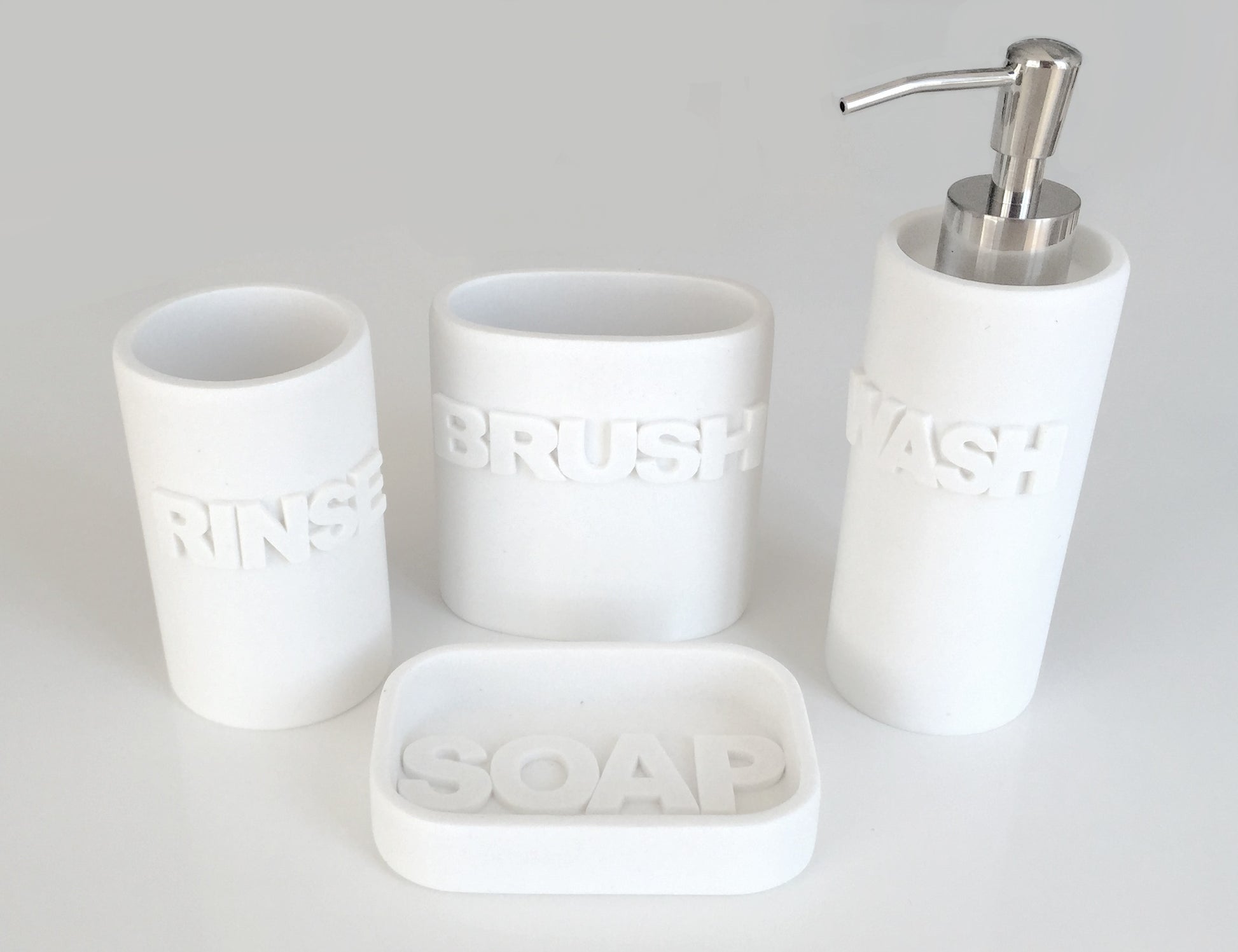 Wash up in style with this Wash Time bathroom accessory set. Includes 1 lotion pump, tumbler, toothbrush holder and soap dish. Made of high quality ceramic. The Wash Time bath accessories make washing up whimsical and fun! Made of high quality ceramic Easily wipes clean Lotion Dispenser measures 8"H x 2.5"Dia; Tumbler measures 4.5"H x 2.75"Dia