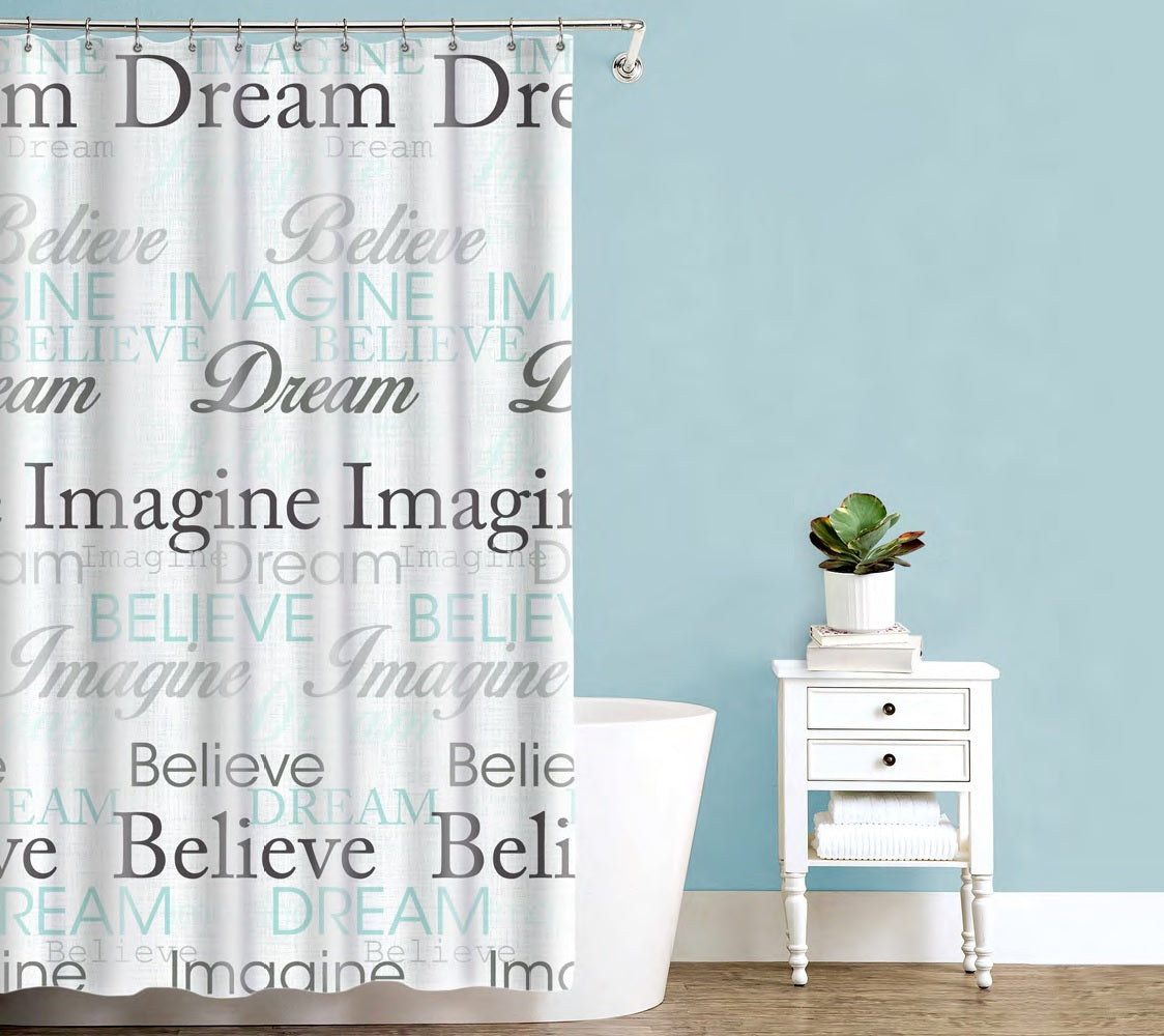 Add whimsy and spirit to your bathroom with the novelty Dream Imagine Believe Inspirational Shower curtain! 100% Polyester, 70" x 72" Add inspiration to your home with this novelty Dream Imagine Believe shower curtain! Measures 70" x 72" 100% Polyester Machine washable