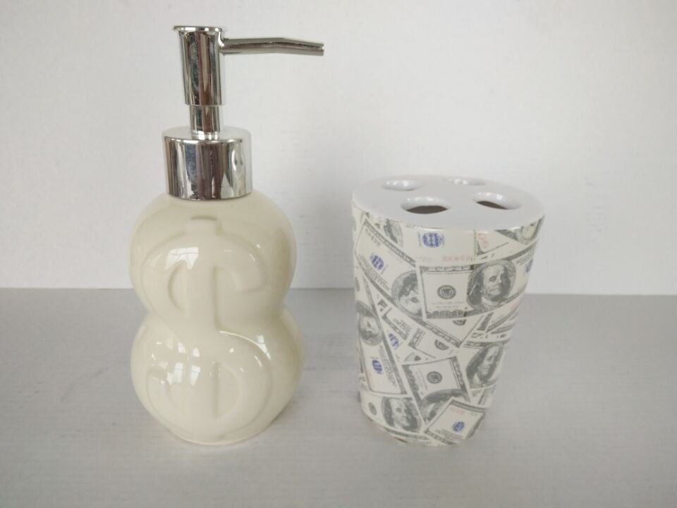 Add style to your bathroom with this Novelty $$ Dollar Bill Tower Ceramic Lotion Dispenser/ Soap Pump and Toothbrush Holder! Set of 2 Novelty Ceramic Bath Accessories Lotion Pump/ Soap Dispenser Measures 6.75"H x 2.75"Dia Toothbrush Holder Measures 4"H x 2.75"Dia Easily wipes clean Comes in nice gift box - makes a great gift!