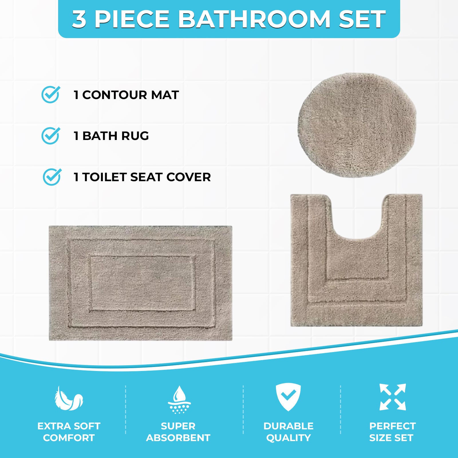 3-piece bathroom mat set includes a 21" x 32" bath rug, 20" x 20" contour mat, and 18" x 19" toilet lid cover